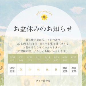 8/11(金・祝)〜8/15(火)までお盆休みのため、休診とさせていただきます。